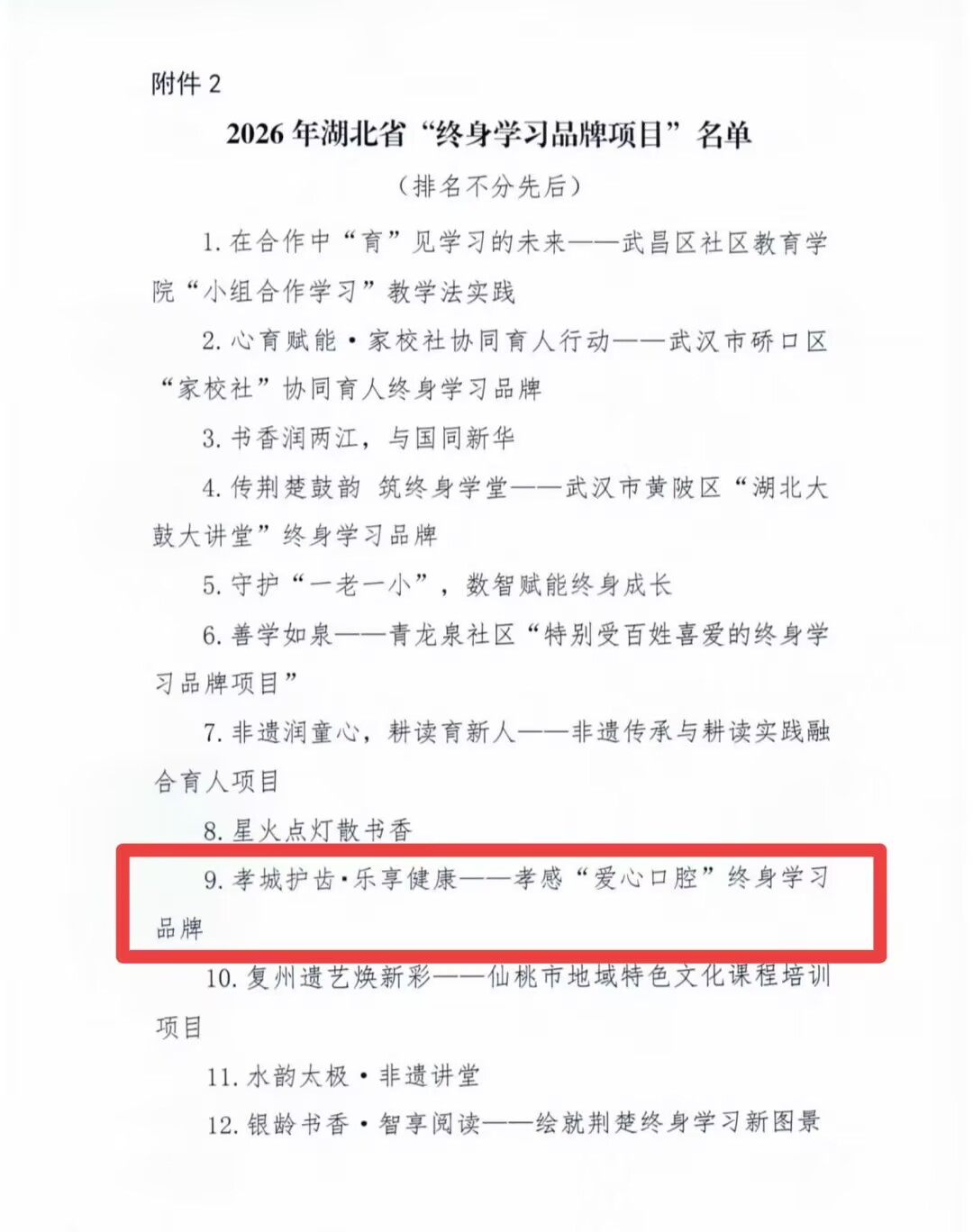 近日,湖北省2026年终身学习品牌项目评选结果揭晓,我校“孝城护齿・乐享健康——孝感‘爱心口腔’终身学习品牌”成功入选。