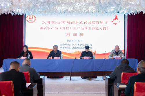 11月26日,汉川市2025年度高素质农民培育项目——重要农产品(畜牧)生产经营主体能力提升培训班顺利开班。本次培训由汉川市农业农村局主办,湖北职业技术学院信息工程学院承办,来自汉川市畜牧行业的50余名养殖专业户参与培训。信息工程学院党总支书记段毅、副院长吴春花,汉川市农业农村局科教股股长王艳芬、畜牧兽医技术推广中心支部书记万信高等出席开班仪式。仪式由继续教育学院副院长汪向东主持。